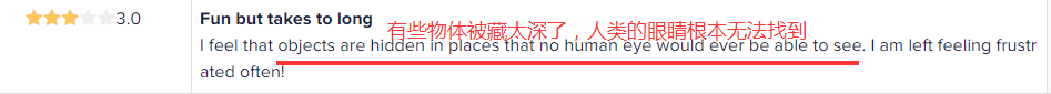 而这主要源于被找物品隐藏太深。有些用户的吐槽颇有趣,表示玩这款游戏不是都是年轻人,有很好的视力,有些物体太小或被藏的太深,无法找到,也有用户表示,凭借人类的眼睛根本就无法找到那些物品。