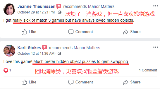 在《庄园事物》Facebook用户推荐页面,有玩家表示已经厌烦了三消类游戏,但一直喜欢找物游戏。