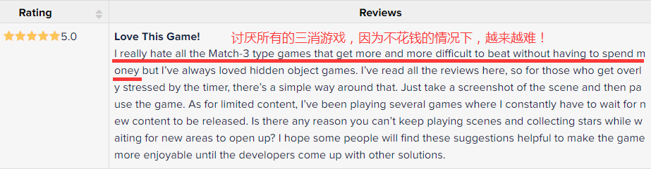 在App Store同样有用户表示讨厌三消游戏,因为如果不花钱,闯关会越来越难,而《庄园事物》比消除类游戏有新鲜感。