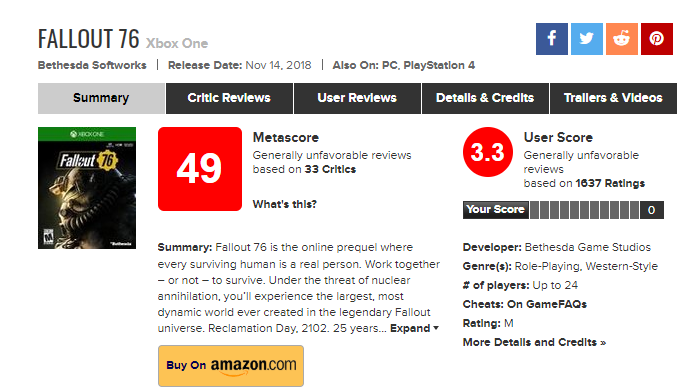 B社的这次网络化尝试,可以说是让自己碰了一鼻子灰。本来想要借助《辐射》这个IP,构建一个全球玩家在废土上共同冒险的趣味世界,做一个长线稳定的项目,结果因为技术、运营、决策等多层面的错误引起恶性连锁反应,可以说是十分令人唏嘘了。也不知道靠单机游戏享誉全球的B社,2019年对于游戏网络服务的相关设计是不是真的想明白了。