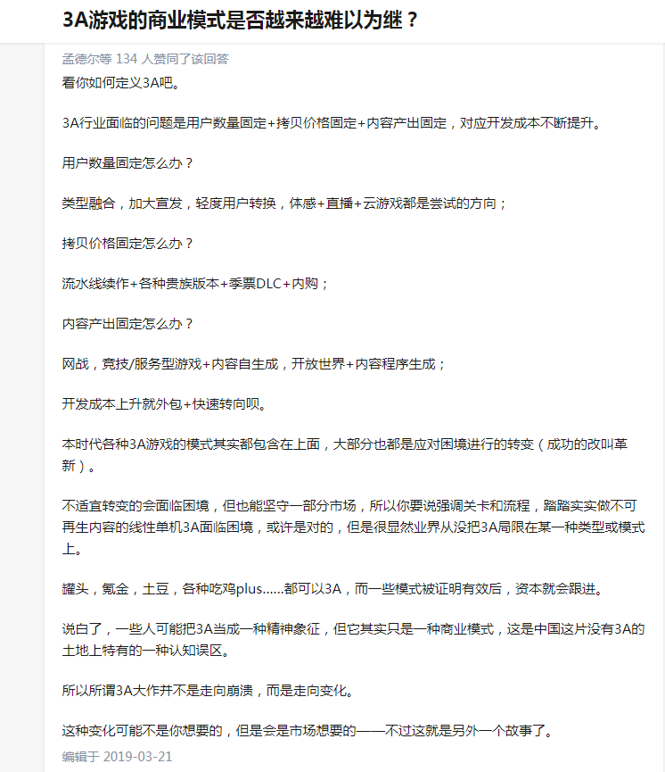 在第三方数据统计机构 Newzoo 发布的2019 年全球游戏市场报告中,主机市场有了13.4%的增速,甚至还超过了移动市场。3A游戏仍有进一步扩张的空间,但开发商或许需要改变思路,将资源投入到更精准的位置。吸收近几年欧美厂商的教训,思考如何把“纯粹堆叠技术的3A”变成“好玩的3A”,是下一世代的重要命题。