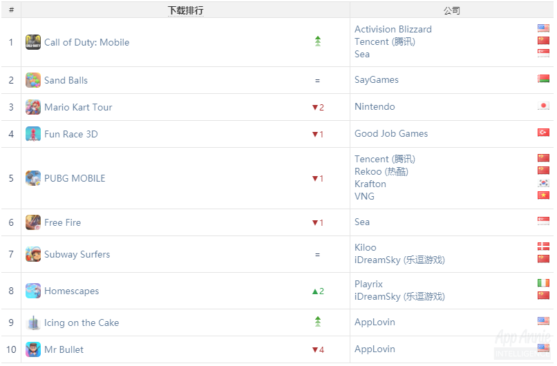 10月份的全球iOS & Google Play游戏下载总榜,有两款新进榜游戏,分别是夺得榜首的《使命召唤手游》,和排名第9的超休闲游戏《Icing on the Cake》,两者分别在美国iOS免费榜上排名第5和第10。