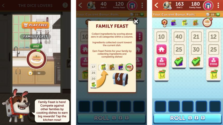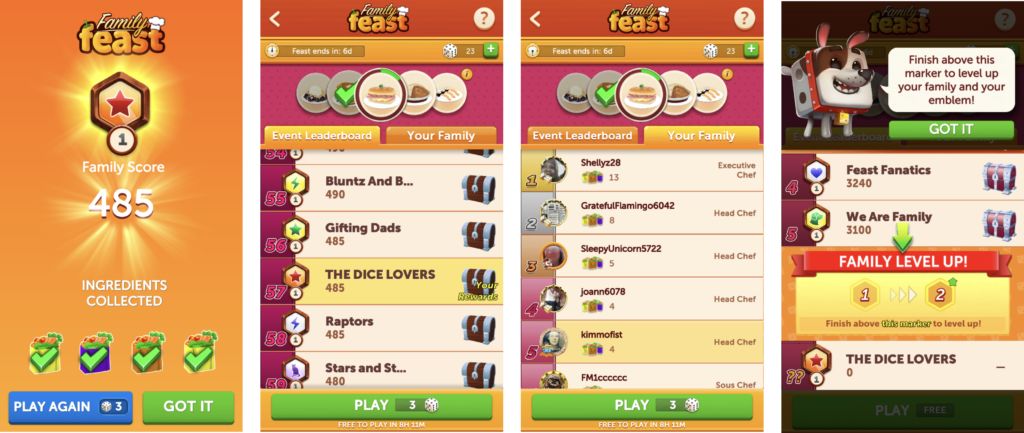 《Yahtzee with Buddies Dice》则是加入了“家庭宴会活动”,以收集“原料”为竞争。所有参与的公会都会获得奖励,头部的公会在竞争阶梯中会上升到新的级别。