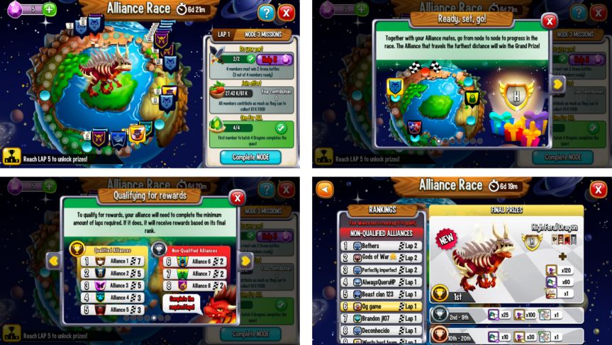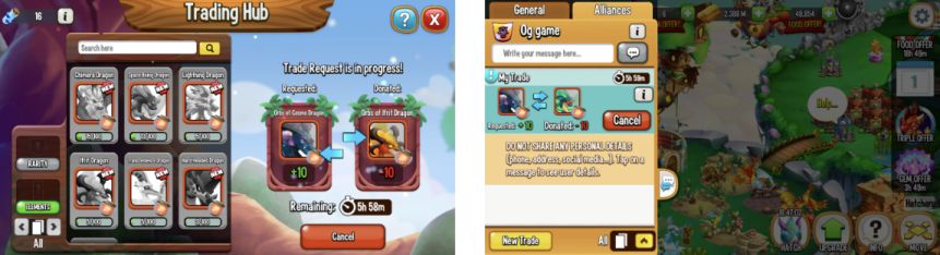 《Dragon City Mobile》是另一个加入公会竞技活动的好例子。在这款游戏中,加入了联盟竞速,即公会成员完成个人及成员之间共同任务的比拼。头部公会将会获得跟龙相关的奖励。而且游戏中加入了公会交易系统,公会成员可以交换龙珠。