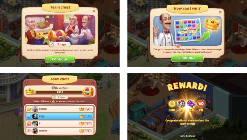 比如《梦幻花园》增加了联盟宝箱活动,联盟成员在消除中获得“皇冠”,皇冠数累计到一定数量就会打开团队宝箱,整个公会的成员都能获得奖励。