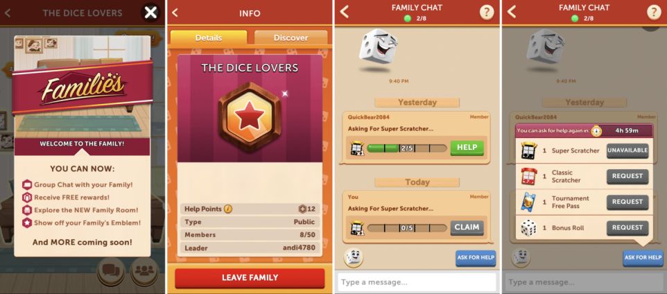 《Yahtzee with Buddies Dice》也是类似的方式,不过发送/请求帮助的功能做的更为深入,允许用户要求赠送道具。