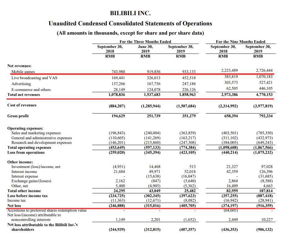 11月18日,哔哩哔哩(简称B站)发布了截至2019年9月30日的第三季度未经审计的财务报告。财报显示,B站第三季度总收入为18.6亿元人民币,比2018年同期增长72%,净亏损进一步扩大,达到4.06亿元。