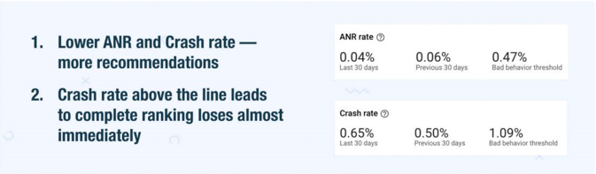 质量是2019年ASO优化的首要主题。App Store和Google Play优先考虑为用户提供较佳体验的高质量应用,减少崩溃闪退和加快响应速度至关重要,更低ANR(Application Not Responding,应用无响应)和崩溃率的App在Google Play中能够得到更多推荐,你可以在Google Play后台查看数据,以了解自家产品的位置。