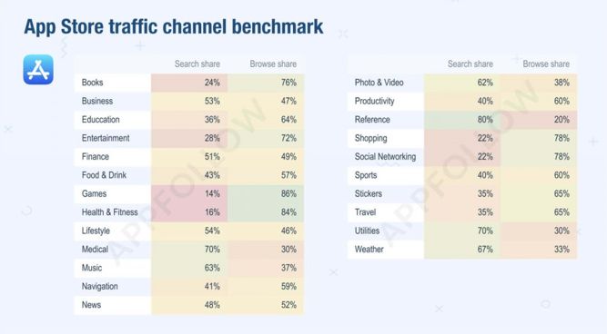 ASO优化的未来很可能是浏览器,尽管这类频道的作用被许多开发者低估了,但其实它们依然拥有很大的空间和流量。事实上,几乎所有类别的应用都能通过类似渠道获得大部分流量。“健康和健身”类应用的流量中,有高达84%来自浏览。此外,只有医学和音乐类应用仍然可以从搜索中获得大部分流量。