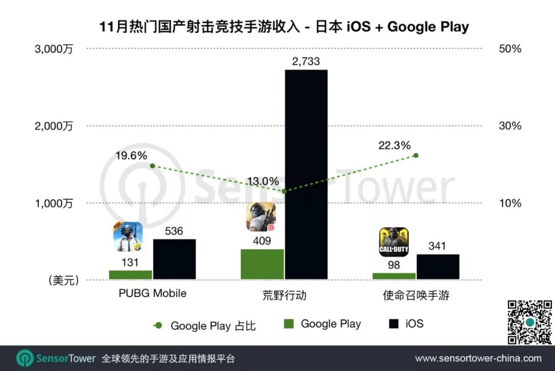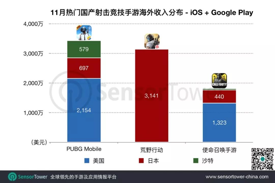 根据Sensor Tower数据,11月,《荒野行动》98%的海外收入来自日本,达3141万美元;《PUBG Mobile》和《使命召唤手游》的主流海外市场是美国,各有2154万美元和1323万美元的收入。