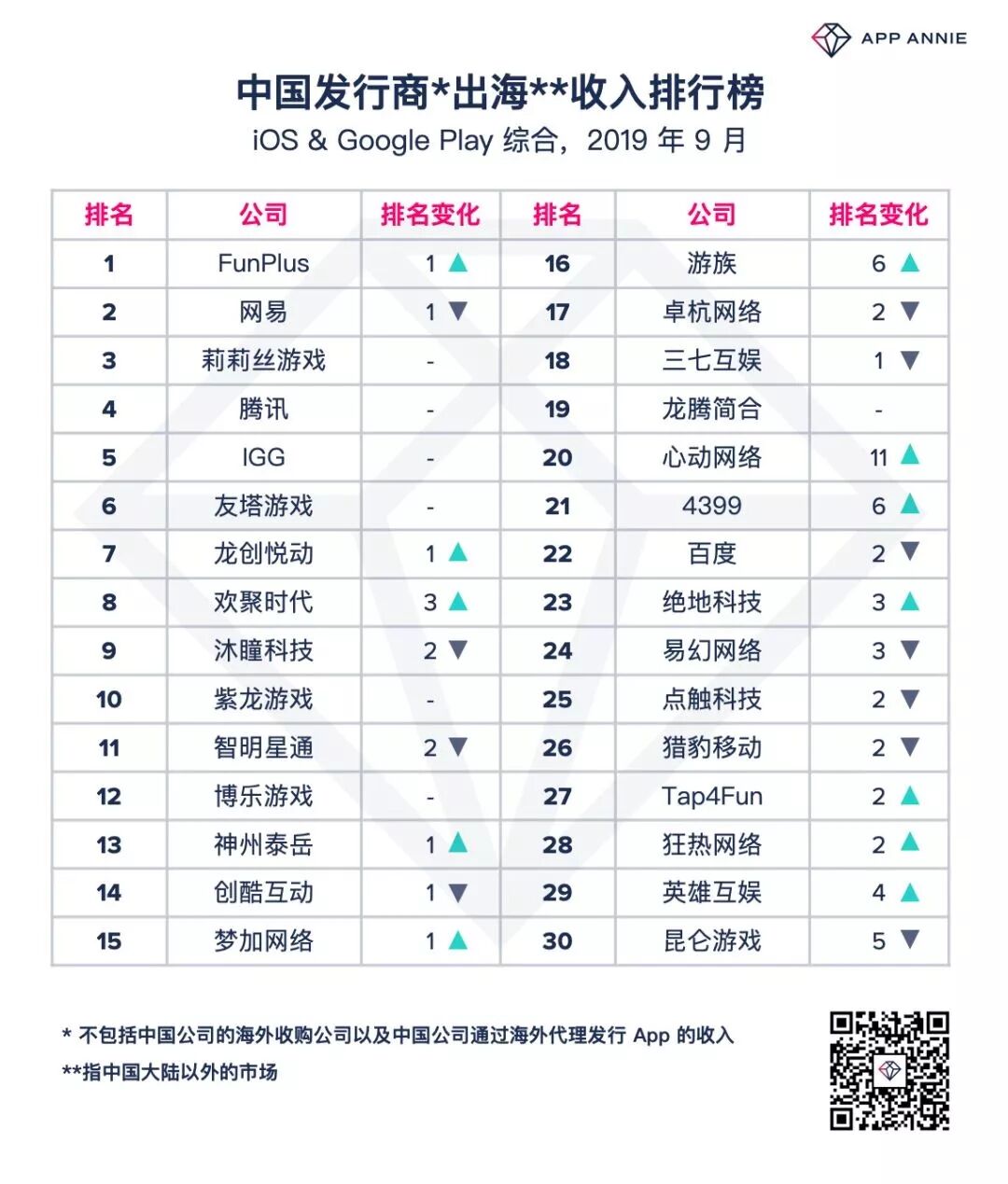 根据App Annie中国发行商出海收入排行榜,点点互动(FunPlus)在2018年连续8个月霸榜,并且位列2018全年总榜第1位。2019年截至11月,点点互动也已有8个月位居App Annie中国发行商出海收入排行榜榜首,拿下2019年总榜第1指日可待。