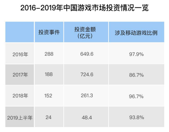根据硬核联盟发布的《2019硬核联盟白皮书》,2019年上半年,游戏投资事件仅有24起,推测整年约50起左右,与2016年近300起投资事件相比有大幅缩水。同时,投资金额在经历2017年的724.6亿元小巅峰后,2018年迎来暴跌,2019年全年预计仅100亿左右。