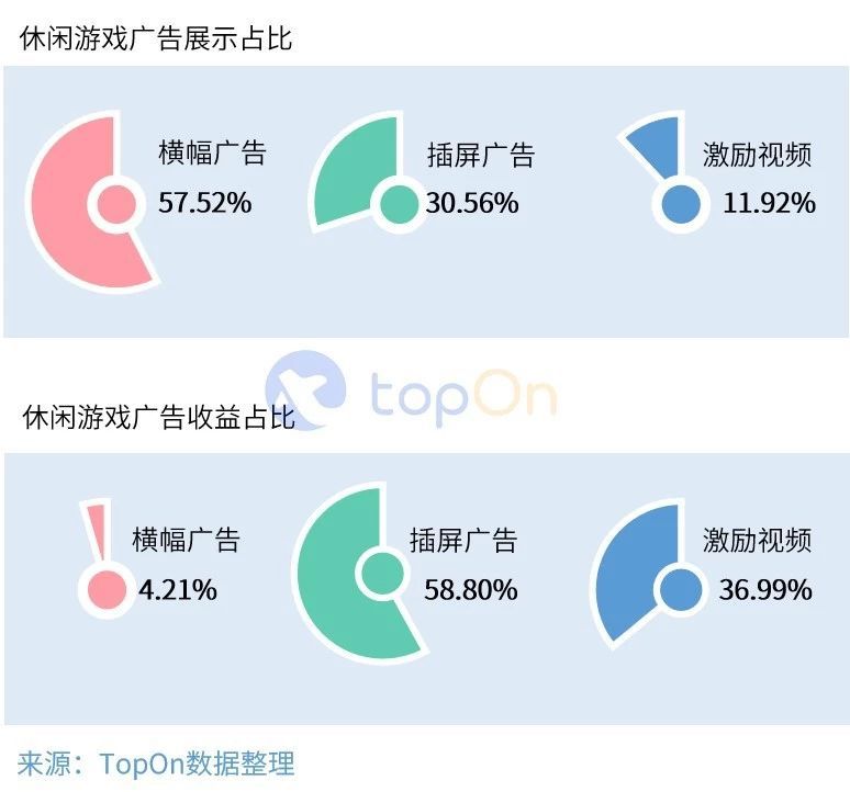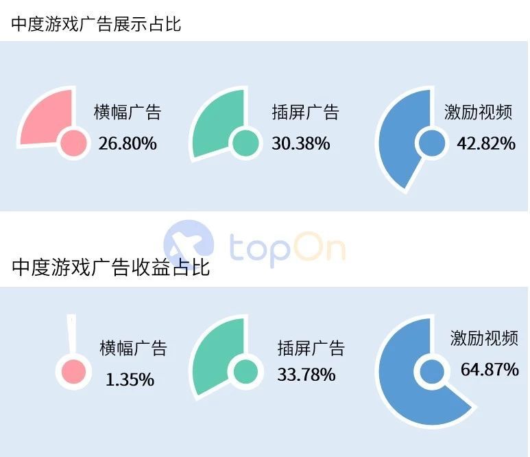 而横幅广告只有玩法偏轻度的游戏使用,因此中度游戏对其的应用较少,展示占比26.81%,广告收益也较低,占比仅1.35%。