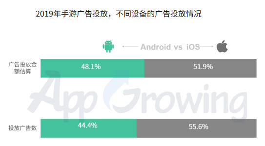 投放设备方面,2019年手游在iOS的广告投放金额(估算)、及广告投放数量分别为51.9%和55.6%,均大于安卓。