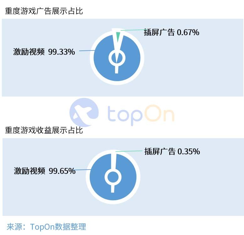重度游戏以内购收入为主,主要目标是保证用户的游戏体验、增加用户粘性、满足用户的游戏体验。广告方面,仅有激励视频可以做到,因此展示和收益占比均超过99%。