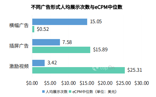 激励视频受制于玩家的主动点击,人均展示次数不高,但广告效果较好,eCPM以25.31美元领跑
