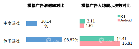 相反,得益于休闲游戏玩法简单,横幅广告可以在游戏顶部、底部以及暂停页长期放置,展示较为稳定,因此在休闲游戏的渗透率高达98.82%。人均展示次数也同样高峰值,iOS端为14.41次,安卓端为16.81次,体现了对广告变现的收益依赖性。