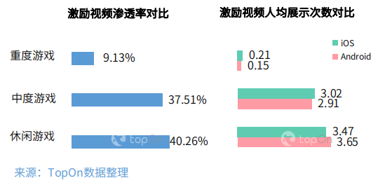 由于激励视频展示权掌握在用户手中,因此渗透率相对不是特别高,尤其是重度游戏,仅9.13%,iOS和安卓双端人均展示次数均不足1次,潜力较大。