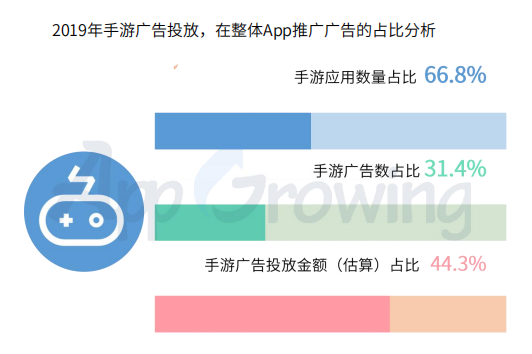 2019年整体的移动广告投放中,手游行业广告数占比仅31.4%,手游广告投放金额(估算)占比44.3%,买量的总体支出更加谨慎保守。