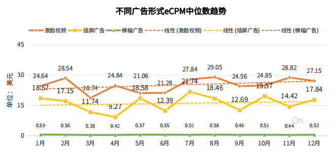 整体来看,广告变现市场的收益情况缓慢向上发展。eCPM峰期集中在寒暑假,游戏市场用户得到大量释放,激励视频eCPM分别在2月和8月达到28.54美元和29.05美元。
