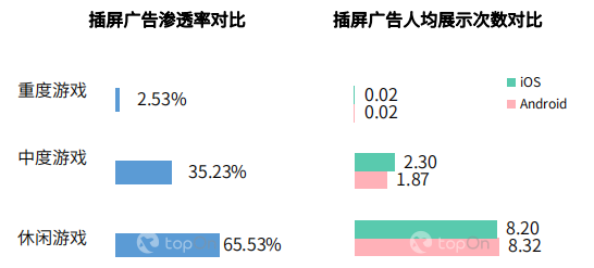 相对的,插屏广告在休闲游戏的数据上得到了大幅提升,渗透率高达65.53%,iOS端和安卓端的人均展示次数均超过8次。