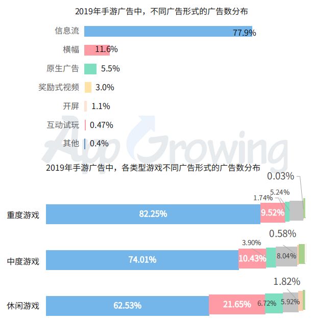 重度、中度、休闲游戏的广告形式,也和整体游戏广告的格局相似,信息流广告分别占比82.25%、74.01%、62.53%。休闲游戏的横幅广告相对较多,占比21.65%。
