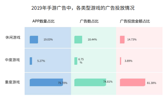 把2019年买量的手游按休闲(跑酷竞速、飞行射击、消除、棋牌扑克、休闲益智)、中度(卡牌、塔防、虚拟养成、体育运动等)、重度(策略经营、角色扮演、动作格斗)划分,可以发现,整个买量市场依然以重度游戏为主,App数量占比75.7%,广告数占比74.81%,广告投放金额占比81.38%。