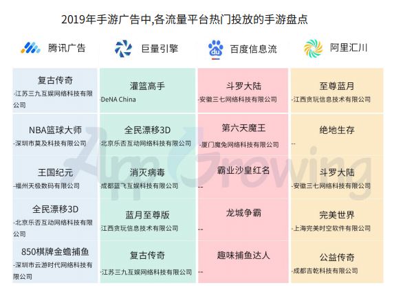 基于各游戏在对应平台的广告投放金额(估算),梳理出2019年各大流量平台的热推手游,腾讯广告为《复古传奇》、巨量引擎为《灌篮高手》、百度信息流为《斗罗大陆》、阿里汇川为《至尊蓝月》。