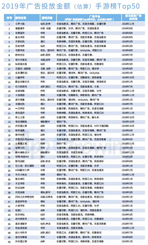 2019年投放金额(估算)TOP50的手游中,有25款游戏的开始投放时间为2018年。其中,2018年12月开始投放广告的《斗罗大陆》在2019年强势买量,占据榜首。