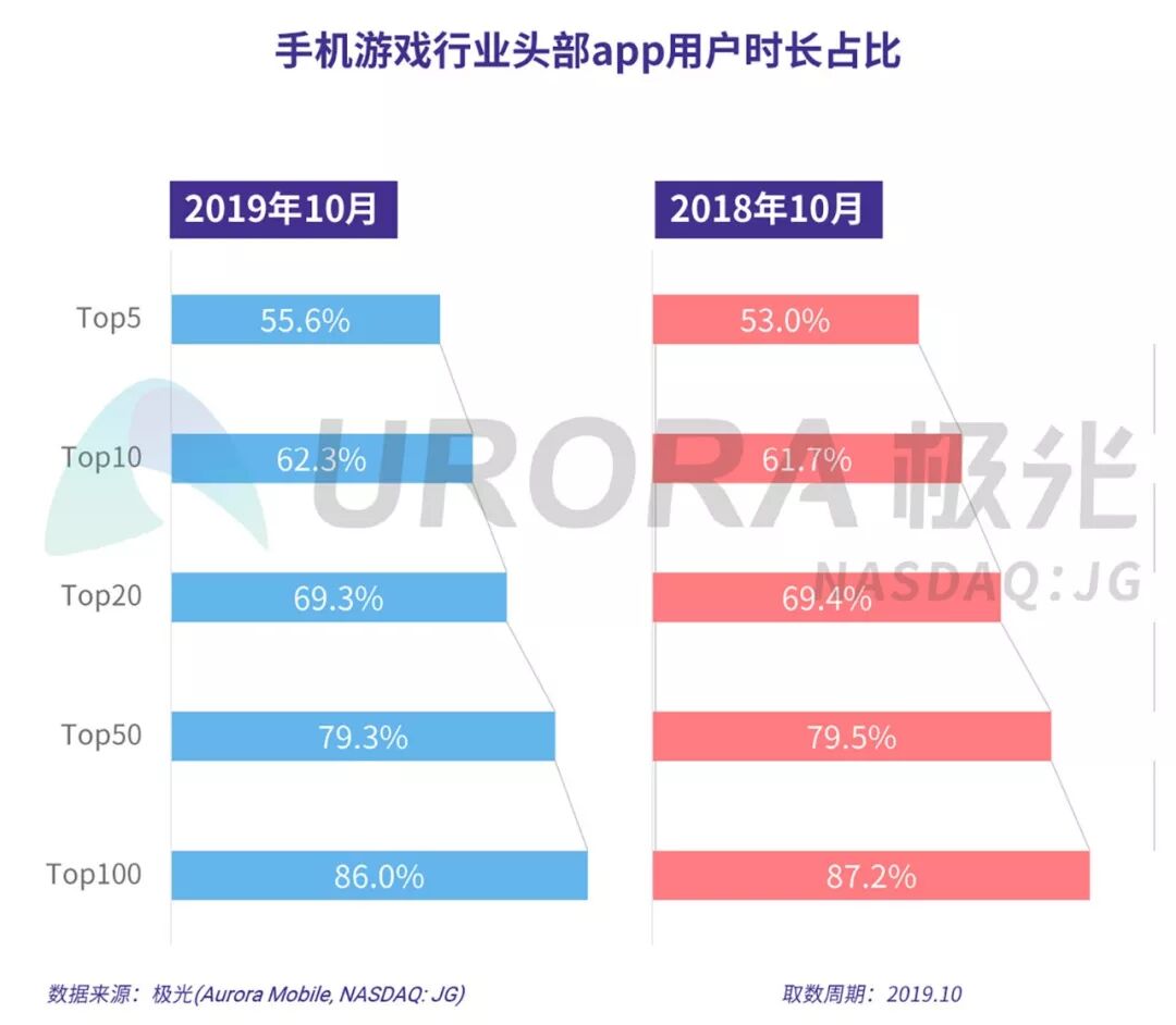 按产品等级划分手游总时长,可以看到,2019年,头部TOP5的手游App用户时间占比较高,达55.6%(2018年为53.0%),TOP10时长占比为62.3%(2018年为61.7%)。与2018年相比,头部手游占据时长比例增长,手游行业集中度上升。