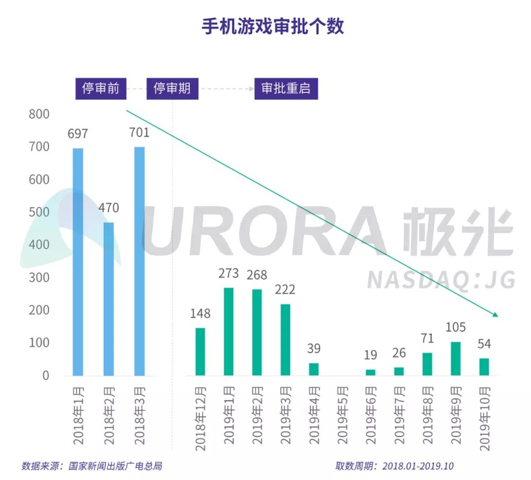 2018年12月版号审批重启后,过审版号数量明显低于停审前,且2019年下半年数量更趋下降,10月仅54个。对行业的提振作用不明显。