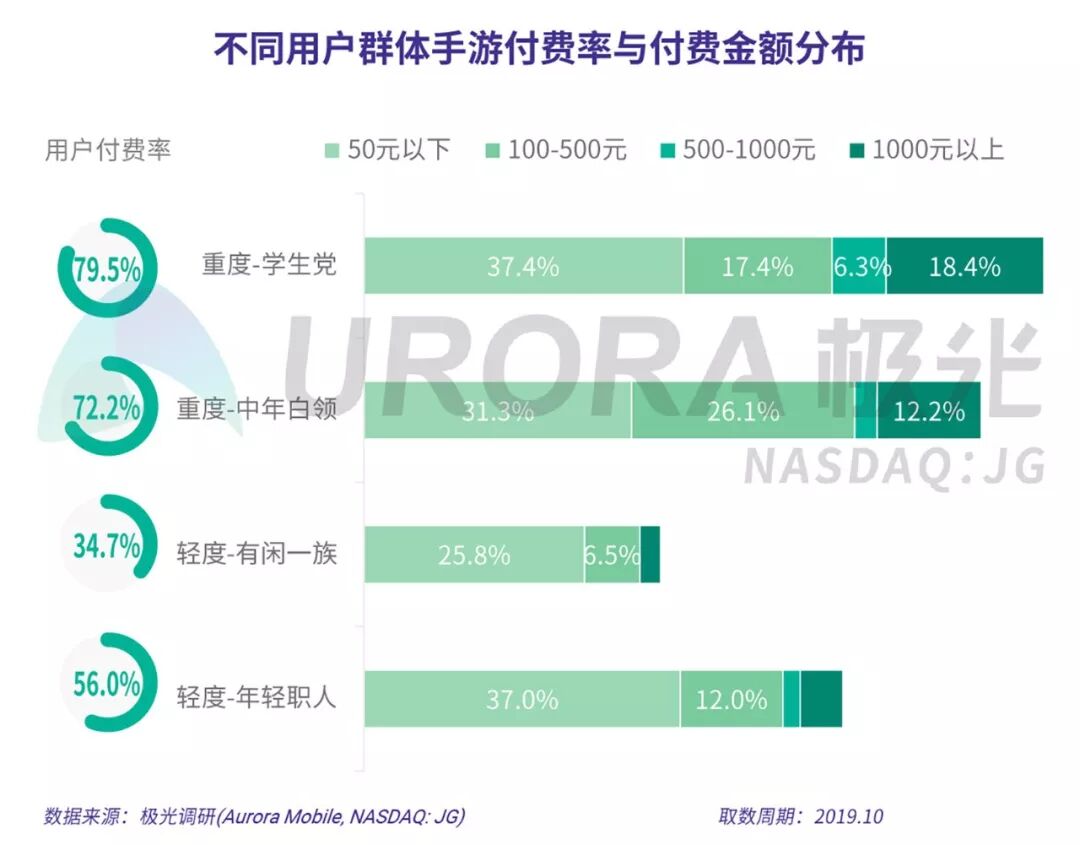 从不同的用户群体来看,重度-学生党的付费率较高,达79.5%;其付费金额也较大,近25%的用户付费金额超过500元。重度-中年白领的付费率虽然不低(72.2%),但1000元以上的仅12.2%。