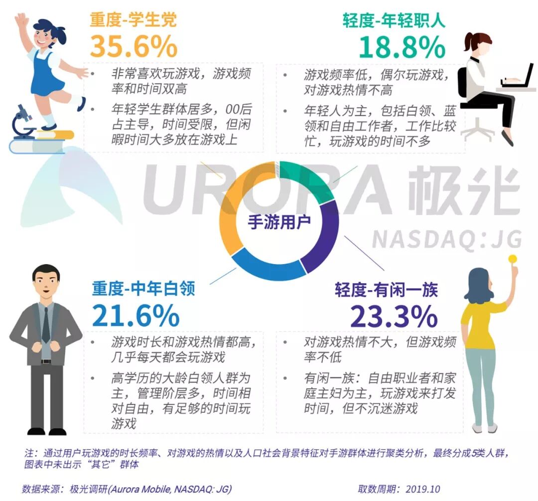 报告根据用户玩游戏的时长频率、对游戏的热情及社会背景特征,将手游群体分为重度-学生党(35.6%)、重度-中年白领(21.6%)、轻度-年轻职人(18.8%)、轻度-有闲一族(23.3%)。