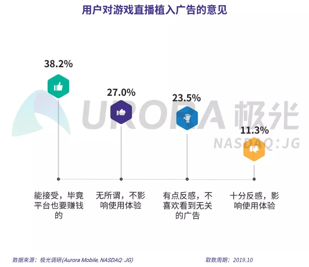 对于游戏直播植入广告,近4成的用户表示接受,27%的用户认为无所谓,十分反感的仅有11.3%,说明用户对广告的接受度较高。