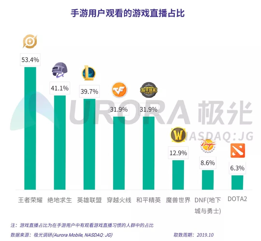 在所有的游戏直播中,《王者荣耀》较受欢迎,用户观看占比超50%;其次是《绝地求生》和《英雄联盟》,两者观看用户占比在40%上下。
