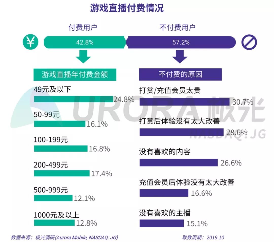 游戏直播中,付费用户不足一半,仅42.8%;且超4成的付费用户过去一年的付费金额在100元以下;付费金额在1000元及以上的占比12.8%。