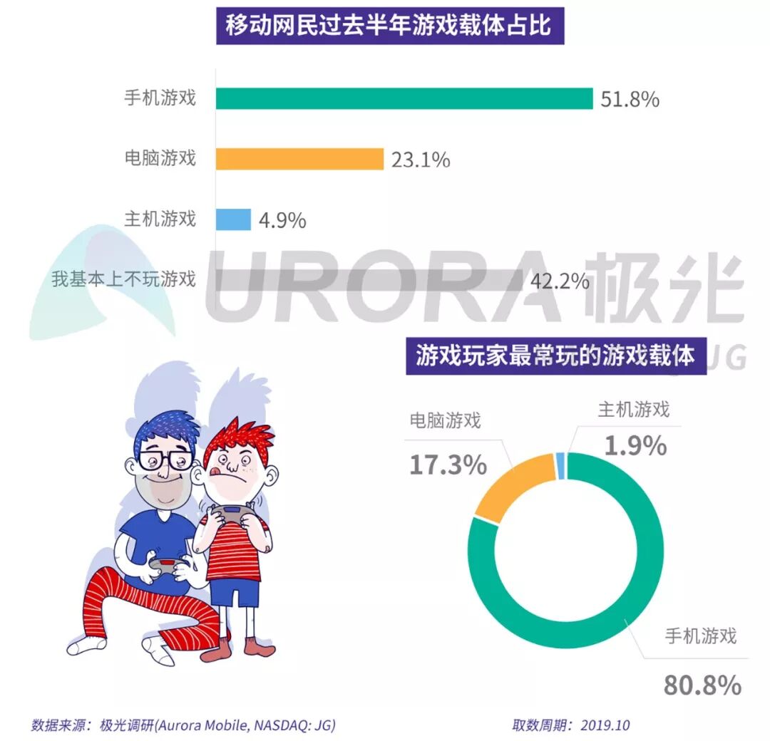 由于手游门槛低,能填满人们的碎片化时间,过去半年,移动网民中手游玩家人数规模达51.8%,远远大于端游(23.1%)和主机游戏(4.9%)。同时,手游玩家玩游戏的频次也较高,达80.8%。