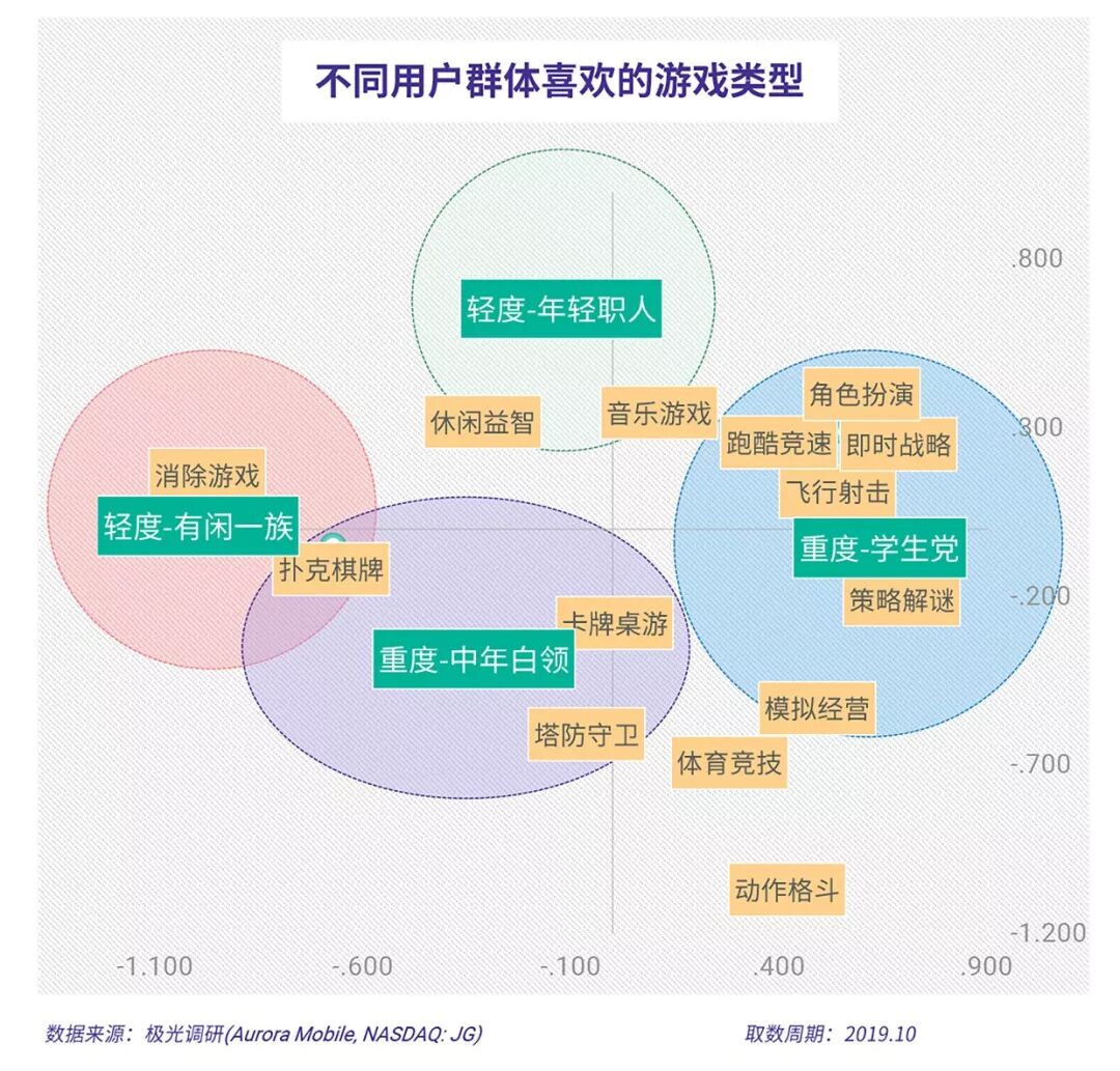 可以发现,不同用户群体喜欢的游戏类型差异较大。重度-学生党喜欢即时战略、飞行射击等重度游戏,而重度-中年白领则喜欢上手难度较低的游戏,如卡牌桌游、塔防守位等。轻度手游用户也更偏向轻度手游。