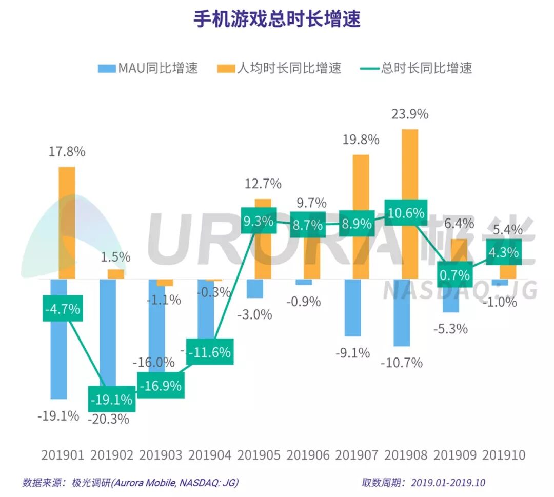 虽然MAU减少,但人均玩游戏时间变长。5月开始,受人均时长增长带动,手游总时长同比回暖,8月期间达到高峰,人均时长同比增速23.9%,总时长同比增速10.6%。