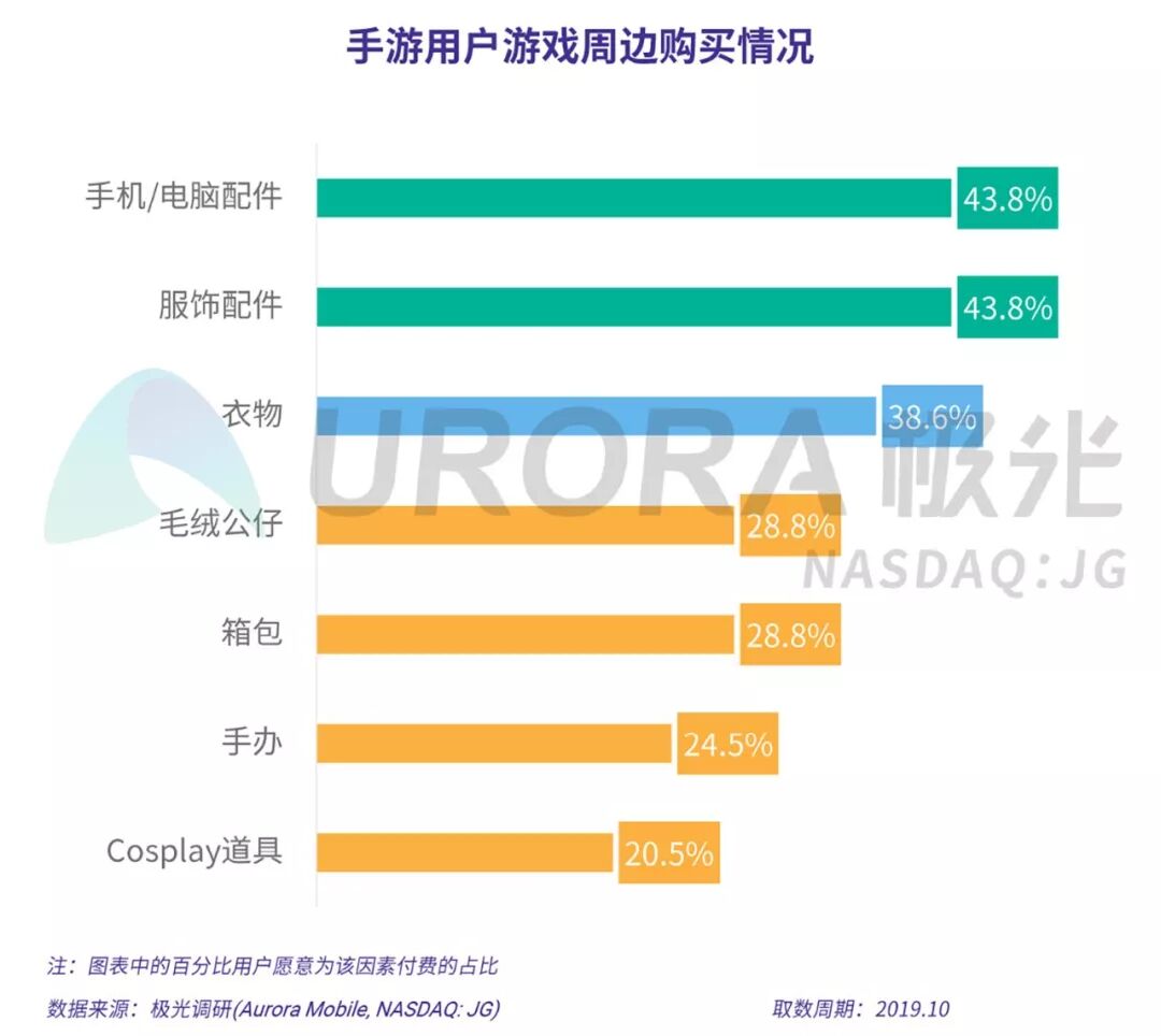在游戏周边产品的购买上,玩家喜欢手机/电脑配件和服饰配件,两者购买比例均为43.8%;Cosplay道具较为小众,占比仅20.5%。