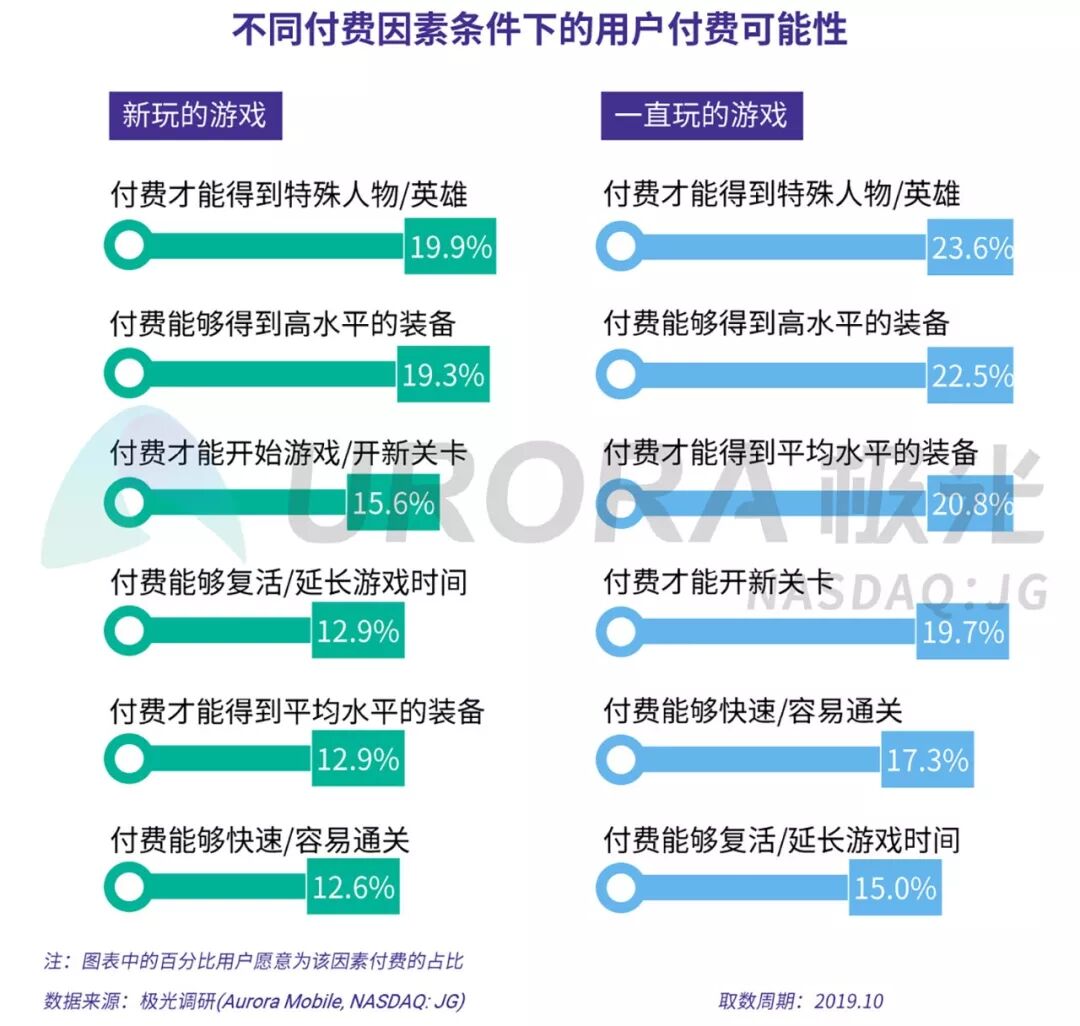 对于一直玩的游戏,用户的付费可能性整体高于新玩的游戏。在两种背景下,付费获得特殊人物/英雄是较有吸引力的,付费可能性分别为23.6%和19.9%。其次是高水平装备,付费可能性为22.5%和19.3%。