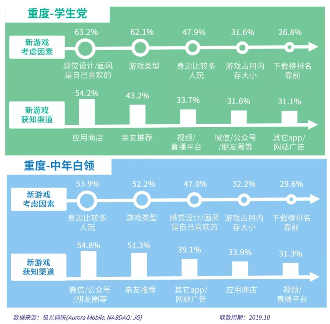 重度-学生党热爱游戏,主动性也较高,他们多在应用商店挖掘游戏(54.2%),更注重游戏设计/画风是否合心意(63.2%)、以及是否是喜欢的游戏类型(62.1%)。