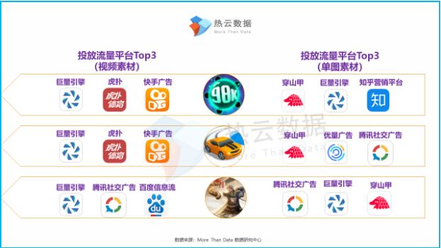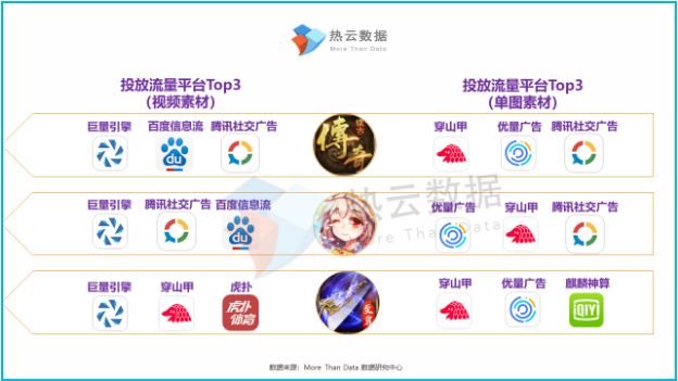 以下为3款手游投放视频与单图广告数量占比Top3流量平台展示。可以看出,头条系是三款产品均有涉及的板块;在腾讯系单图素材方面,《复古传奇》、《闪烁之光》选择走广点通进行买量投放,《蓝月至尊版》则选择百度旗下的爱奇艺渠道。
