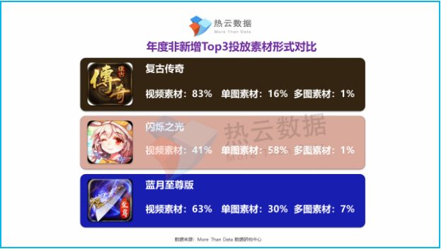 根据3款手游投放素材的类型进行横向比对后发现:闪烁之光主要以单图素材为主;复古传奇与蓝月至尊版的视频素材占比为主体,其中复古传奇的视频素材占比超过8成。