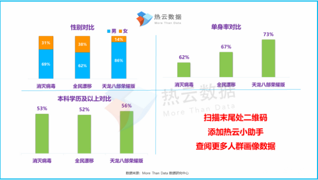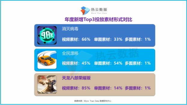 根据3款手游投放素材的类型进行横向比对后发现:全民漂移主要以单图素材为主;消灭病毒与天龙八部荣耀版的视频素材占比为主体,其中天龙八部荣耀版的视频素材占比超过8成。