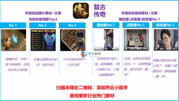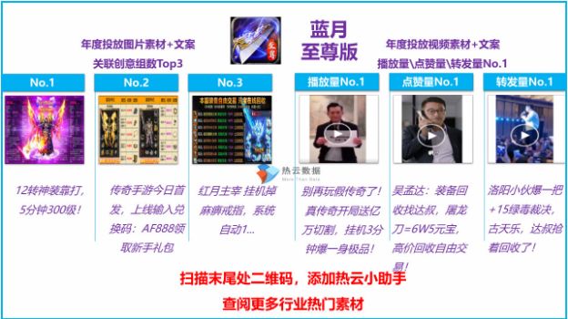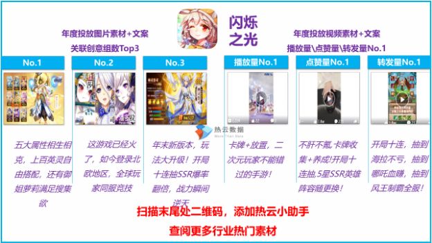 以下是3款手游年度投放创意组Top(图片素材)以及播放、点赞、转发量Top(视频素材)展示。