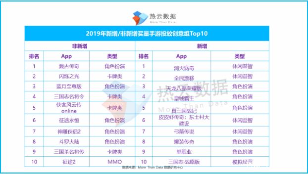 近日,热云数据公布了《2019年度热门投放手游买量洞察报告》,通过Adinsight对买量手游投放创意组数量前500款产品进行数据监测。