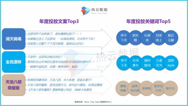 从全年投放的趋势来看,《消灭病毒》在今年3月份投放近4万份广告素材之后,其投放力度就呈现下滑趋势;《全民漂移》则在今年5月份开始抢占《消灭病毒》颓势之后的空白期,成为休闲品类的新兴产品;《天龙八部荣誉版》则在今年下半年开始发力。