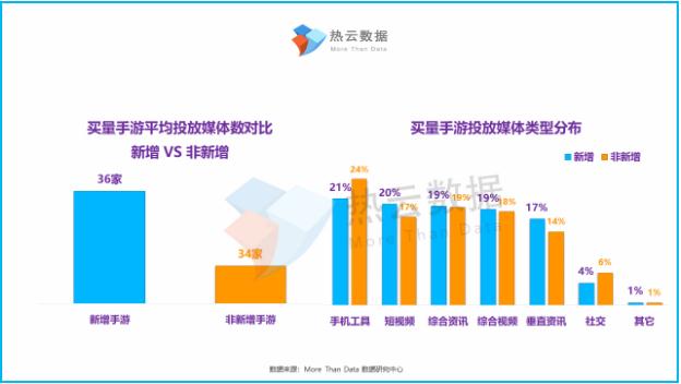 根据Top500手游平均投放媒体数量来看,新增买量手游同样超过非新增手游。此外,根据Top500投放媒体类型分布来看,手机工具类媒体仍成为No.1;但对于新增手游来说,他们对于短视频以及垂直资讯类媒体的青睐程度高于非新增。