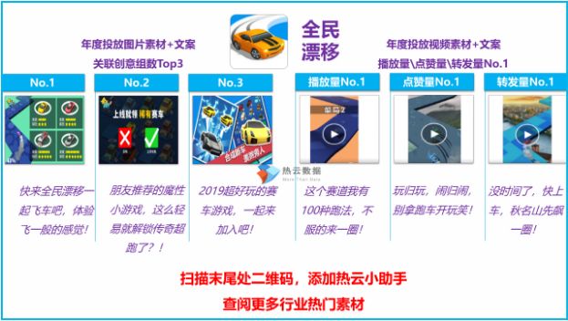 从投放关键词可以看出,《消灭病毒》与《全民漂移》虽然同属休闲品类,但其各自的投放关键词各不相同。《消灭病毒》更喜欢切入用户的碎片化、社交等属性;《全民漂移》则以五菱宏光、秋名山等用户所熟知的车类名词作为买量素材。